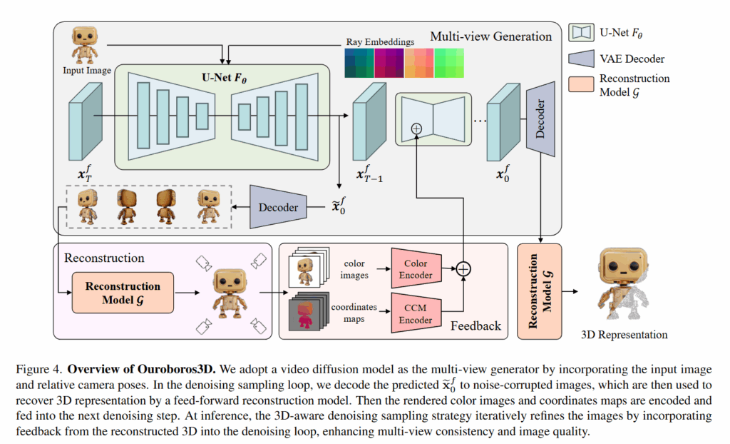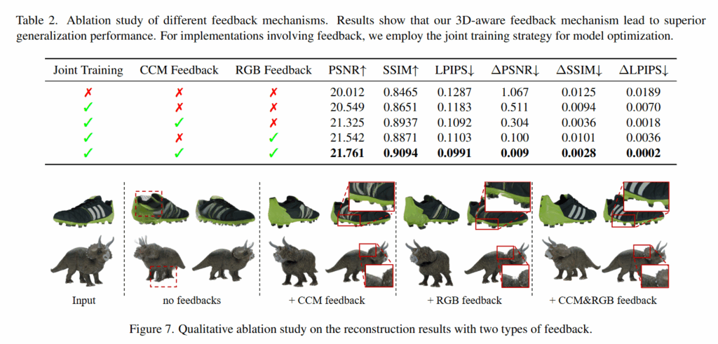 추론 과정에서는, 초기에는 3D 피드백 조건을 0으로 설정한 후, 각 타임스텝마다 이전에 재구성된 3D 결과를 기반으로 피드백 정보를 업데이트합니다. 이 업데이트된 조건은 다음 노이즈 제거 과정에 입력되어, 이미지 생성과 3D 복원이 반복될수록 점점 더 정교한 결과를 낼 수 있도록 한다고 합니다.