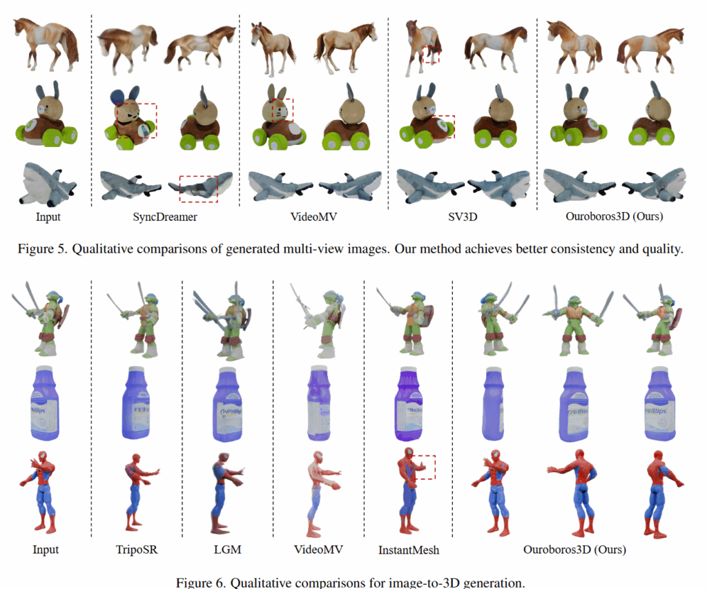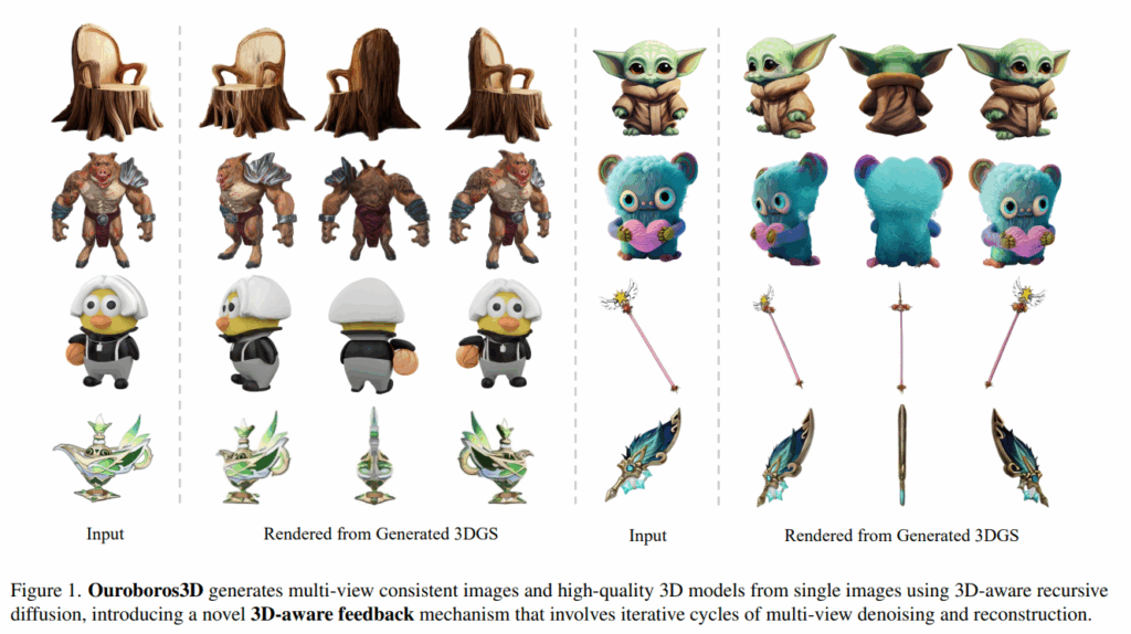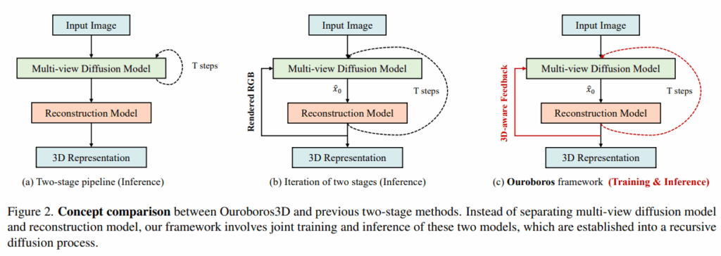 이러한 한계를 해결하기 위해 저자는 멀티뷰 이미지 생성과 3D reconstruction을 하나의 recursive diffusion 안에서 통합해 3D-aware feedback 메커니즘을 통해 재구성된 3D 정보를 이미지 생성에 활용하고 joint training을 통해 두 모듈이 상호작용하며 학습하게 만들어 도메인 차이를 줄이고 더 정교한 결과를 얻을 수 있었다고 합니다. 뿐만 아니라 이 프레임워크는 다양한 종류의 multi-view 생성기 및 재구성기와 호환될 수 있도록 설계되었다고 합니다.