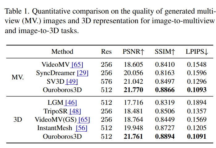 성능 평가는 생성된 다중-뷰 이미지 및 해당 이미지로부터 복원된 3D Gaussian Splatting(3DGS) 결과와, ground truth 영상 간의 유사도를 기반으로 수행됩니다. 주요 평가 지표로는 LPIPS(Learned Perceptual Image Patch Similarity), PSNR(Peak Signal-to-Noise Ratio), SSIM(Structural SIMilarity)이 사용되었습니다. 멀티뷰 이미지 생성은 SyncDreamer, SV3D, VideoMV와 비교하였으며, Image-to-3D 는 TripoSR, LGM, InstantMesh(Nerf) 등 feed-forward 기반의 모델들과 성능을 비교하였다고 합니다. 이 때 LGM과 InstantMesh는 기존의 투스테이지 기법들이라고 합니다. 정성적인 결과를 확인해보면 시점 간 정합성과 디테일 보존이 뛰어난 이미지를 생성하는 것이 시각적으로 확인됩니다.