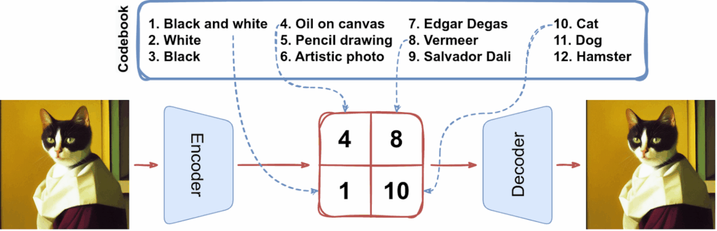 - 이미지를 일정한 격자 형태로 나눈 뒤, 각 영역을 정해진 상단 이미지처럼 코드북의 이산 토큰으로 표현합니다.