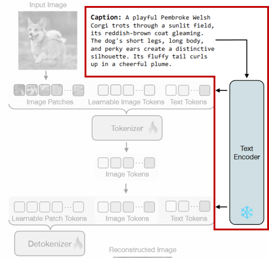 이 텍스트는 *T5 모델을 통해 텍스트 임베딩으로 변환되며, 이 임베딩은 Tokenizier 뿐만 아니라 이후 De-Tokenizier 에도 함께 전달됩니다. 즉, 텍스트는 토큰 압축과 다시 복구하는 전 과정에서 일관된 의미 정보를 제공하는 역할을 하죠.