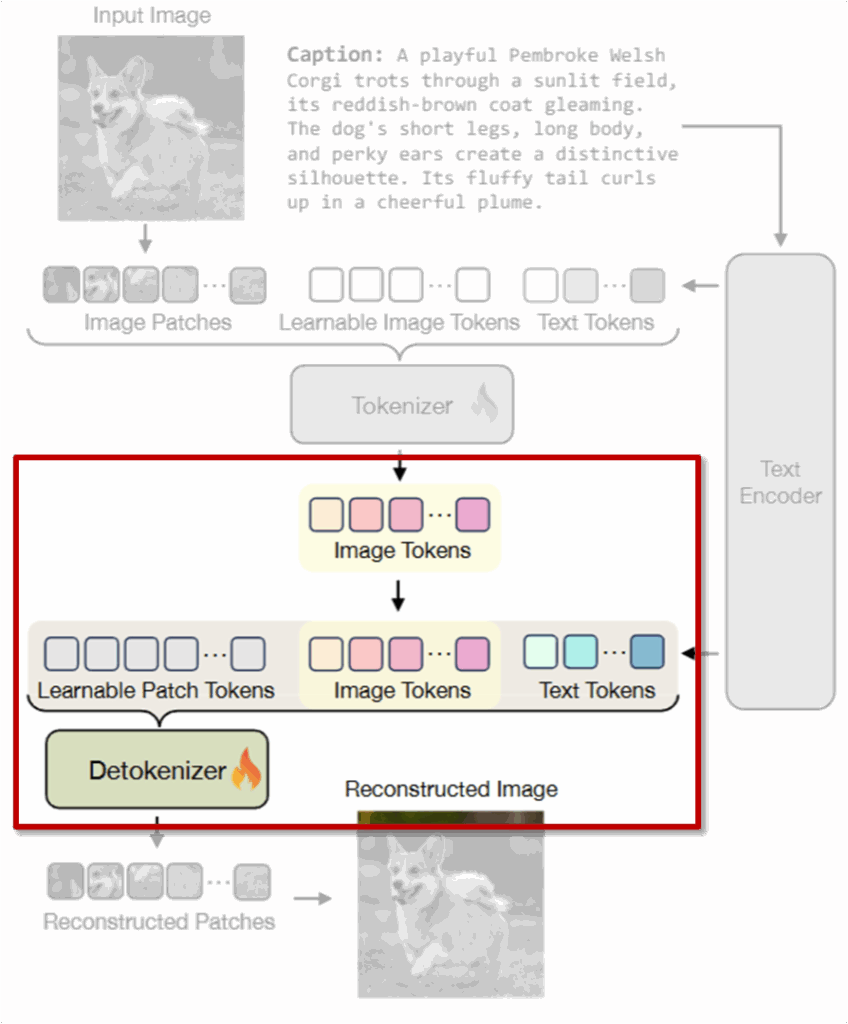 여기서 중요한 포인트는, Generator는 이미지 latent token만 생성하면 되고, 텍스트 임베딩은 detokenizer에서 직접 받는다고 합니다. 다시 말해, Generator 입장에서는 의미 정보는 이미 텍스트로 주어졌기 때문에 이미지의 시각적 디테일만 생성하면 되는 구조이죠.