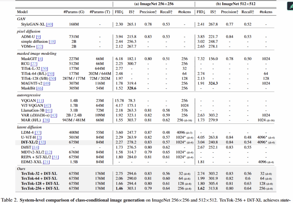 참고로 256, 64, 32는 생성에 사용된 이미지 토큰 수를 의미합니다. TexTok-32는 이미지를 32개의 연속적인 토큰으로 압축한 뒤 생성에 사용하는 버전이죠. TexTok은 텍스트 임베딩을 통해 작은 토큰 수로도 고품질의 이미지를 생성할 수 있었다고 합니다.