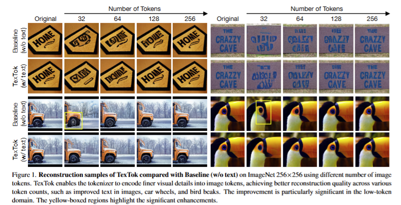 동일한 토큰 수를 사용할 경우 TexTok은 더 선명하고 세부 묘사가 잘 살아있는 이미지를 생성하는 반면, Baseline(w/o text)은 상대적으로 흐릿하고 구조가 무너진 결과를 보여주었습니다. 특히 토큰 수가 적을수록 이 차이는 더욱 도드라졌다고 하네요.