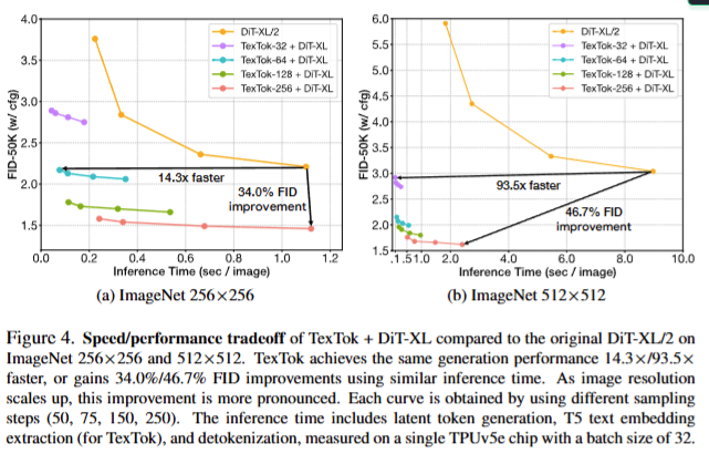 뿐만아니라, 단순히 토크나이저만 TexTok으로 바꾸는 것으로도 256×256에서 14.3배의 속도 향상, 또는 동일 속도 기준 34.3% FID 향상을 달성하였다고 합니다. 512×512에서는 93.5 배의 속도 향상 혹은 46.7% FID 향상 + 3.7배 더 빠른 inference 타임을 보였습니다. 다시 말해, 해상도가 커질수록 TexTok의 효과는 더욱 극대화되며 토크나이저의 효과를 볼 수 있었죠