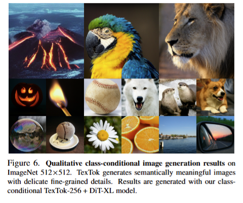 위의 이미지는 TexTok 기반으로 class-conditional 하게 생성된 것입니다. 생성 이미지는 텍스트의 클래스 조건에 맞춘 정교한 구조와 의미 표현이 잘 반영되어 있으며, 세부 디테일 또한 뛰어났다고 그림과 함께 보여주었습니다.
