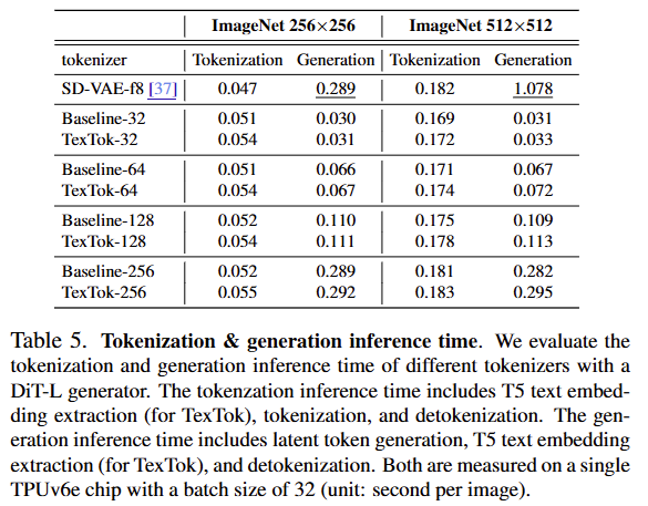 ImageNet 256×256, 512×512 해상도에서 TexTok은 Baseline 대비 Tokenize 시간은 유사하거나 약간 증가했지만, 생성 속도는 전반적으로 빠르거나 비슷한 수준을 보였다고 합니다. 특히 TexTok-32는 Baseline-32보다 더 빠르게 생성되며, SD-VAE-f8 대비 압도적으로 낮은 생성 시간(예: 0.289 → 0.054)을 보여줍니다.