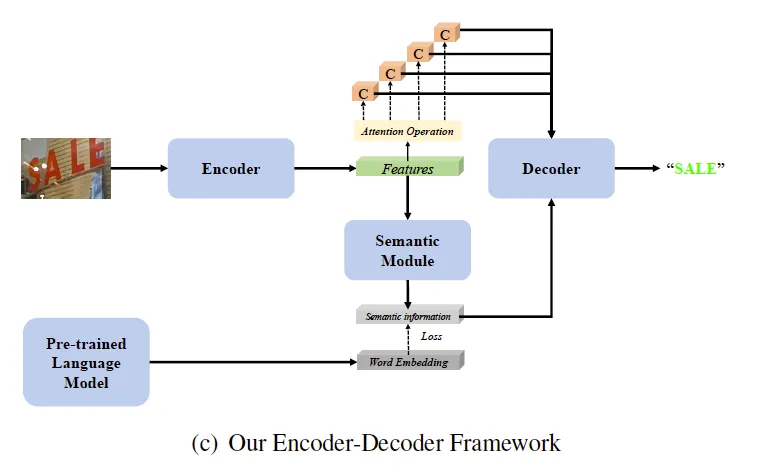 그리고 제안한 것이 Semantics Enhanced Encoder-Decoder framework (SEED)입니다. 텍스트를 인코딩할 때 visual feature만을 extract하고 마는 것이 아닌 이를 활용해 semantic information을 함께 예측하는 것입니다. 그리고 이를 global information으로 활용해 decoding을 수행하는 것이다. 이때, 모델은 사전 학습된 language model로 부터 supervise를 받아 semantic information을 예측해 실제 단어가 갖는 semantic information을 충분히 represent할 수 있게 합니다.