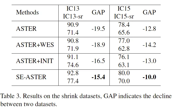 실제 task recognition은 text detection과 함께 수행되어야 하는 경우가 많습니다. 부정확한 detection으로 인해 incomplete text같은 상황이 발생하고 이런 경우 정확한 recognition이 이뤄지지 않게 됩니다. 이를 error accumulation이라고 하는데 논문의 저자는 incomplete text같이 low-quality의 텍스트에 대해 강인함을 가진 SEED 모델이 해당 문제에 대한 대안이 되겠다고 하며 진행한 실험입니다. 평가 이미지에 대해 랜덤하게 일부를 제거한 shrinked 데이터셋을 구축해 평가를 진행해 성능이 하락하는 정도를 비교하였습니다. SE-ASTER는 학습 시 데이터에 대해 증강을 일절 하지 않았습니다. 결과를 정리하자면 논문에서 제안한 방법으로 성능 향상 폭을 다른 방법과 비교해서 크게 줄일 수 있었습니다.