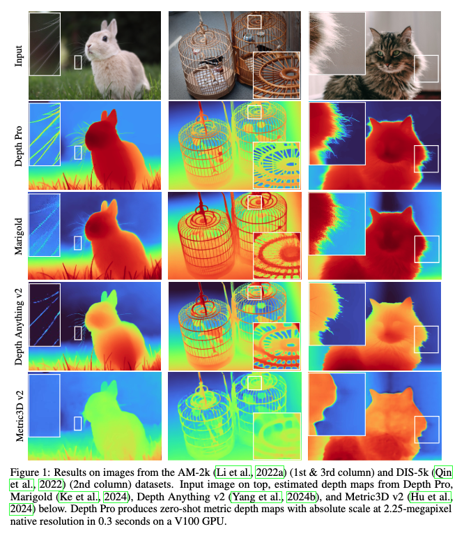 이러한 전략들을 사용함으로써 Depth Pro는 복잡한 장면에서도 세밀한 영역까지 뚜렷하게 추정할 수 있고, 동시에 초 단위 이하의 빠른 추론 속도를 갖추고 있어, 기존 모델들과는 차별화되는 정확도와 실용성 모두를 만족시키는 성능을 보여주는 논문이라고 보시면 될 것 같습니다.