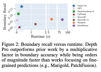 그림 1은 앞서 언급한 것과 같이 대표적인 결과를 보여줍니다. Depth Pro는 객체 경계의 선명한 윤곽(sharp delineation) 추정에 있어서 기존 모든 연구를 능가하고, 머리카락, 털등과 같은 fine한 구조나 섬세한 경계를 잘 처리하는 것을 확인할 수 있습니다. 또 그림 2을 보시면, Depth Pro는 경계 정확도에서 기존 연구들보다 수 배 뛰어난 성능을 보입니다. 정밀한 예측에 중점을 둔 연구들(Marigold, PatchFusion)보다 실행 속도도 수십 배 빠르다는 것을 확인할 수 있습니다.