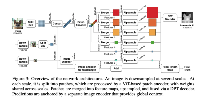 먼저, Depth Pro는 효율적인 multi-scale ViT 기반 아키텍처를 도입합니다. 이 구조는 이미지의 전역적인 context를 포착하는 동시에, 고해상도 상에서의 미세한 구조들 예를 들어 머리카락이나 풀잎처럼 얇고 복잡한 경계선까지도 섬세하게 추정할 수 있도록 설계되어 있습니다. 해당 아키텍처에 대한 자세한 설명은 이후 method 파트에서 다루도록 하겠습니다.