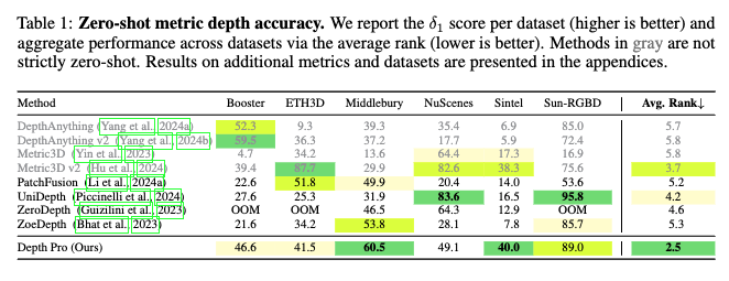 우선 가장 핵심적인 성능지표인 δ1 기준 메트릭 depth 성능을 보면, Depth Pro는 Booster, Middlebury, Sun-RGBD 같은 다양한 도메인에서 전체적으로 고르게 상위권 성능을 보입니다. 실제로 평균 랭크로 봤을 때 가장 낮은 2.5로, 타 모델들 대비 도메인에 특화되게 튜닝하는 것 없이도 가장 일관된 제로샷 성능을 보여준다고 볼 수 있습니다.