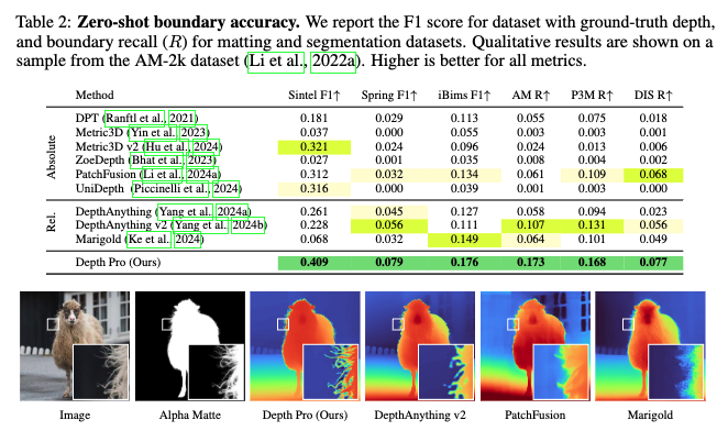 Table 1에서 sintel 데이터셋 부분 metric 3D와 unidepth를 보시면 metric 3D가 17.3, unidepth가 16.5로 metric depth accuracy에서는 metric 3D가 성능이 약간 더 좋은 것을 확인할 수 있습니다. 반면 table 2의 boundary accuracy 평가에서는 unidpeth가 0.316 metric 3D가 0.037로 unidepth가 훨씬 성능이 좋다는 것을 확인할 수 있습니다. 이를 보았을 때 결국 “metric accuracy가 좋다고 해서 경계 품질이 좋은 건 아니다”라는 점을 명확히 보여줄 수 있고, Depth Pro는 경계 품질과 속도 모두를 만족하는 모델이라는 점을 보이는 표라고 보시면 될 것 같습니다.