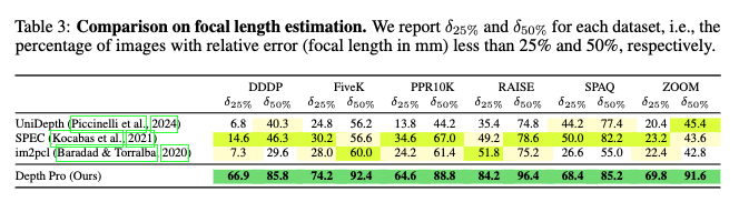 PPR10K 같은 인물 중심 데이터셋에서는 Depth Pro가 64.6%의 이미지에서 25% 이내의 오차를 보였지만, 두 번째로 좋은 SPEC 모델은 34.6%에 그친 것을 확인할 수 있습니다.