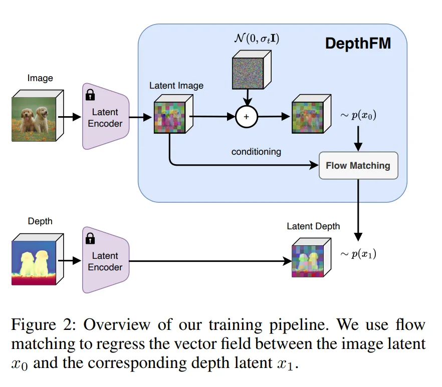 이런 설계가 효과적일 수 있는 이유는 이미지와 depth pair로 이루어진 시작-끝점이라서 데이터 공간에서 의미적으로 매우 가깝기 때문 입니다. 그래서 FM이 diffusion보다 경로가 훨씬 짧아서 빠르고 안정적으로 학습이 가능하죠.