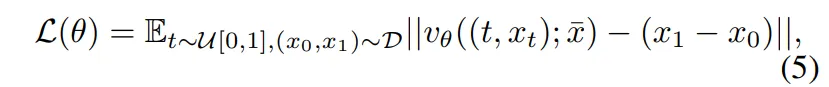 목적은 예측 벡터가 x_1 - x_0와 유사하도록 학습하는데, 여기서 \bar{x}가 사용이 되죠. \bar{x}의 역할은 단순하게 x_t만 주는게 아니라 추가적으로 x_0의 복사본을 조건으로 줘서 이미지를 명확하게 기억하고 방향 예측의 정확도를 높일 수 있도록 합니다. \bar{x}를 통해 모델은 현재 중간 지점 x_t의 위치 뿐만 아니라 출발점인 이미지 정보를 계속 잊지 않고 기억하면서 이동 방향을 예측할 수 있는 것이죠.