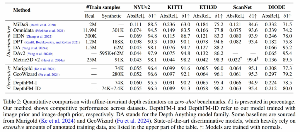 먼저 Tab.2는 DepthFM과 다른 depth estimation 모델과 비교합니다.