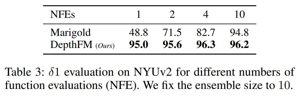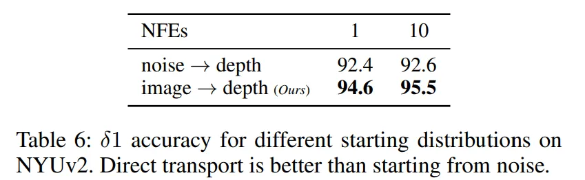 Tab.6을 보면 DepthFM처럼 이미지의 latent 표현에서 시작할 경우에 특히나 적은 수의 평가만으로도 훨씬 더 높은 정확도를 달성하는 것을 확인할 수 있습니다. 이는 실제 입력 정보를 더 잘 반영하는 방식으로, 이미지를 출발점으로 시작하는 것이 학습과 평가에서 모두 더 효율적이라는 것을 보여주고 있습니다.