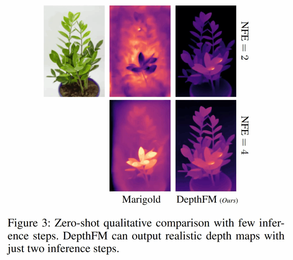 Fig.3으로 정성적 결과를 봐도 적은 샘플링 단계만으로도 실제 scene에 대한 표현을 잘 하는 반면에 Marigold는 일정 수준 이상의 depth map을 생성하기 위해서는 더 많은 단계가 필요하다는 것을 볼 수 있습니다.