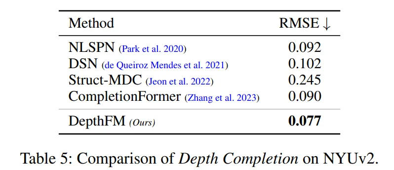 기존 연구에 따라 전체 픽셀 중에 2% 정도의 depth만 주어진 상황에서 DepthFM을 fine-tuning하여 Tab.5와 같이 평가하였다고 합니다.