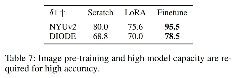 Tab.7을 보면, LoRA를 사용한 경우에는 파라미터의 수가 제한되어 있어서 모델링이 충분하지 않아 이미지 prior가 depth estimation으로 전달이 잘 되지 못한 것으로 보입니다.