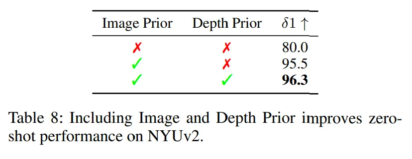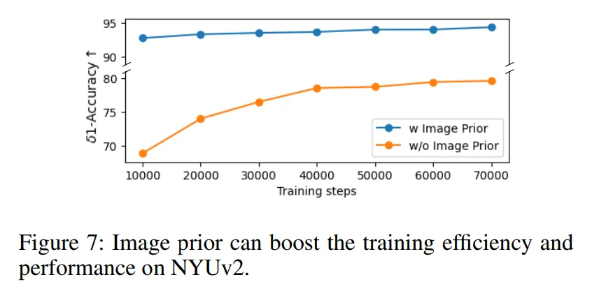 추가적으로 Fig.7을 보면 NYUv2 데이터셋에서 정확도를 학습 단계별로 시각화한 것인데, 이미지 prior를 사용한 경우에 훨씬 속도도 빠르고 정확도도 높은 것을 보여주고 있습니다. 이는 단순하게 성능이 좋은 것 뿐만 아니라 학습의 효율성도 개선되었음을 보여주는 결과 입니다.