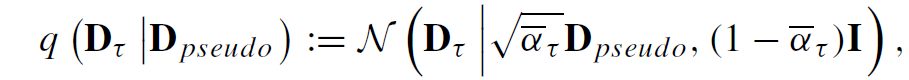 여기서 D_{pseudo} 는 teacher model의 output인 pseudo GT를 의미하며, \bar{\alpha}_{\tow} 는 t step에 따른 noise의 세기라고 간단하게 이해하시면 좋을 것 같습니다.