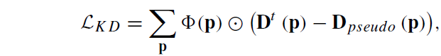 기 오차값들에 대해 아래 수식과 같이 일정 수준 이상의 오차 내에 존재하는 픽셀들에 대해서만 유효한 depth pixel로 판단하여 knowledge distillation loss의 사용할 pseudo GT로 사용하게 됩니다.