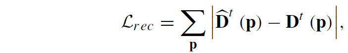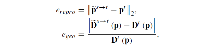pose network가 두 카메라 사이의 상대적인 pose 값을 예측할 수 있기 때문에 depth와 pose 정보를 통해서 target image plane의 좌표를 source image plane의 좌표로 projection할 수 있으며 이를 통해 target frame에서 예측한 depth와 source frame depth를 target으로 와핑시켰을 때의 depth 값의 오차를 계산합니다. 동일하게 x,y coordinate도 source to target으로 warping된 좌표값과 실제 target 좌표값 사이의 오차를 아래와 같이 계산할 수 있습니다.