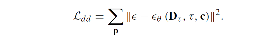 이러한 noise 예측과 이를 통한 denoise 과정이 diffusion에서 모델이 학습하고 prediction하는 과정이며 이 과정은 Coarse resolution부터 Fine resolution까지 모두 동일하게 진행됩니다. 다만 Fine resolution에서는 저자들이 Coarse resolution과 조금 다른 과정을 한가지 더 수행하게 되는데 Coarse level에서는 Visual Condition이 오직 RGB image의 feature로만 추출한다면, 그 이후 finer 과정에서는 이전 resolution에서 예측한 depth map 결과도 convolution 연산을 통해 geometric cue를 뽑아서 RGB feature와 함께 Visual Condition으로 활용한다고 합니다. 그리고 해당 visual condition과 noise predictor를 통해 예측한 noise를 실제 GT noise와 계산하는 diffusion denoising loss를 통해 학습이 진행됩니다(아래수식 참고).