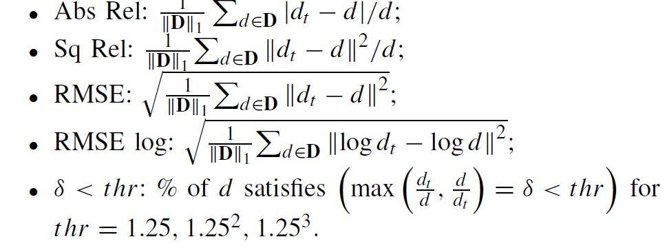 여기서 Abs_rel, Sq Rel, RMSE, RMSE log는 값이 작을수록, delta는 값이 클수록 좋은 성능을 나타내고 있다고 이해하시면 되겠습니다.