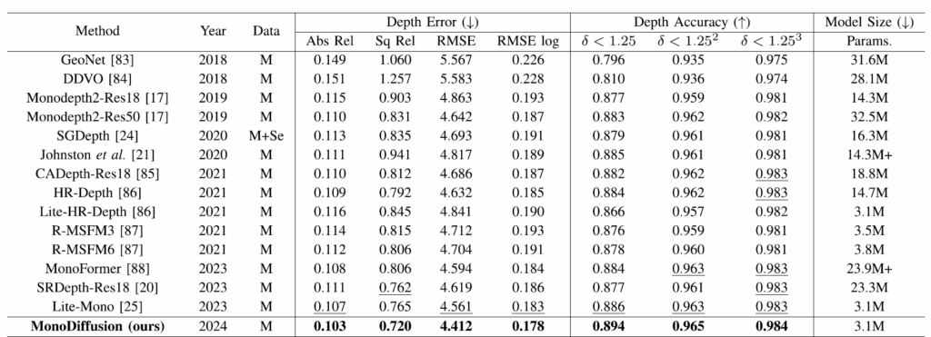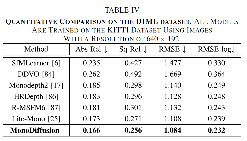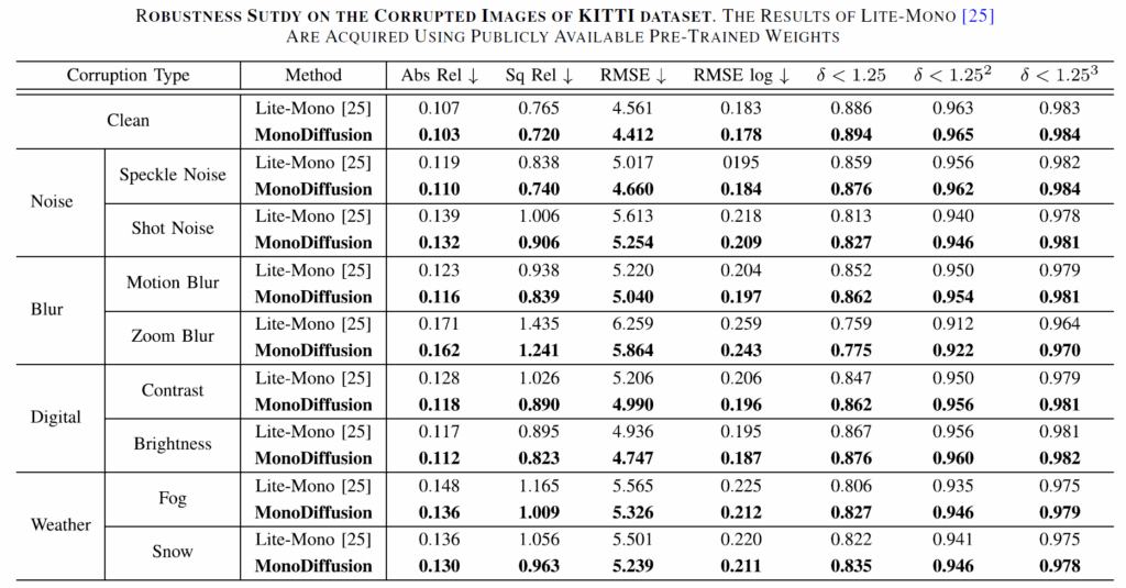 위에 표는 Teacher model로 활용한 Lite-Mono와 자신들의 Monodiffusion 모델이 입력에 다양한 noise가 반영되었을 때 얼만큼의 성능 드랍이 있는지, 즉 얼마나 입력 노이즈에 강인한 깊이 추정이 가능한지를 평가한 것으로, KITTI dataset에 Noise, Blur, Digital, weather 등 다양한 인위적 noise를 적용해서 평가한 것으로 판단됩니다. diffusion model이 noise를 제거하는 방향으로 학습을 하다보니 여러 noise 상황에 대해서 더 좋은 깊이 추정 성능을 보여주는 것이 아닐까 싶습니다.