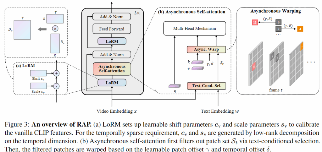 앞선 문제를 해결하기 위해 저자는 Retrieval framework with sparse-and-correlated AdaPter (RAP)를 제안합니다. 구체적으로는 Temporal Sparsity를 고려하기 위해 Low-Rank Modulation (LoRM) 모듈을 제안하고, Temporal Correlation을 고려하기 위해 Asynchronous Self-Attention (ASA)을 제안합니다. 자세한 방식은 다음 섹션에서 설명드리고 저자의 Contribution을 정리하고 넘어가겠습니다.