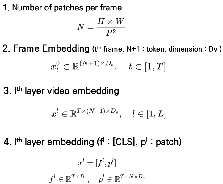 비디오 임베딩은 먼저 각 프레임을 P×P 크기의 patch로 분할하여, 한 프레임당 N=H×W/P2개의 patch를 생성하고, 여기에 CLS 토큰을 포함한 (N+1)개의 token에 대해 임베딩을 수행하며, 이를 통해 t번째 프레임은 xt0∈R(N+1)×Dv 형태의 초기 frame-level feature로 표현됩니다. 이 때 전체 T개의 프레임이 주어지면, l번째 Transformer layer의 비디오 표현은 xl∈RT×(N+1)×Dv로 구성되며, 이를 CLS 토큰 표현 fl∈RT×Dv와 patch 표현 pl∈RT×N×Dv로 분리해 사용할 수 있습니다.