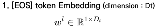 텍스트 임베딩은 입력 문장 끝에 [EOS] 토큰을 추가하여 문장 전체의 의미를 요약하는 global 표현을 얻고, l번째 레이어에서 [EOS] 위치에서의 출력 벡터를 문장 임베딩으로 사용하며 이는 wl∈R1×Dt로 정의됩니다.