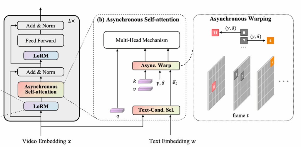 기존의 Self-Attention은 한 프레임 내에서만 패치들 간의 관계를 학습하는데, 이는 영상이 갖는 시간적 흐름을 반영하지 못해 이미지와 영상 사이에 표현 차이(modality gap)가 발생합니다. 이를 해결하기 위해 이 논문에서는 Asynchronous Self-Attention을 제안합니다. 하지만 한 프레임의 패치와 다른 프레임들의 패치들간의 attention 연산을 수행하면 계산 비용이 증가하기 때문에 영상 내에서 텍스트와 의미적으로 관련된 부분에만 Asynchronous Self-Attention을 하기 위해 Text-conditioned Selection을 먼저 수행합니다.