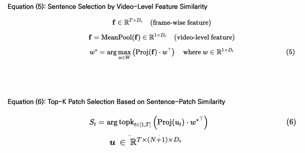 먼저, 프레임별로 추출된 영상 특징들을 평균 풀링하여 하나의 video feature를 만듭니다. 그런 다음 주어진 텍스트 후보들 중에서 이 영상과 가장 유사도가 높은 문장(w*)를 선택합니다. 이후 선택된 문장(w*)과 영상의 각 패치 간 유사도를 계산하고, 그중 Top-K 개의 패치만 골라 집합 St로 정의합니다.