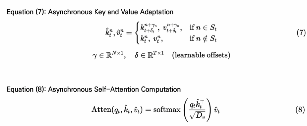 이후 선택된 패치들(St)에 대해서만 Asynchronous Self-Attention을 적용함으로써, 영상 내 시간적 관계를 학습할 수 있도록 합니다. 이를 위해 각 패치의 쿼리는 원래대로 사용하고, 키(key)와 밸류(value)는 오프셋(offset)을 적용해 다른 위치의 정보와 연산을 하도록 구성합니다. 이때 γ는 패치 위치 방향의 오프셋, δ는 시간 축 방향의 오프셋으로, 둘 다 학습 가능한 파라미터이며 모든 레이어에 공유됩니다. 예를 들어, 특정 프레임의 n번째 패치가 선택되었으면, 해당 패치의 키와 밸류는 (n + γn)번째 위치, (t + δt)번째 프레임을 사용해 구성됩니다. 선택되지 않은 패치에 대해서는 원래의 키와 밸류를 그대로 사용합니다.