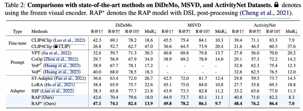 MSR-VTT 데이터셋에서 RAP는 CLIP4clip과 비교했을 때 R@1 기준으로 2.2% 높은 성능을 보였으며, 훈련에 필요한 파라미터를 비교했을 때 0.7%(1.06M vs. 151.28M)의 파라미터만 사용하고도 성능을 높일 수 있다는 것을 보여주었습니다. 또한 다른 프롬프트 튜닝 및 어댑터 기반 방식들보다도 더 나은 성능을 기록했습니다.