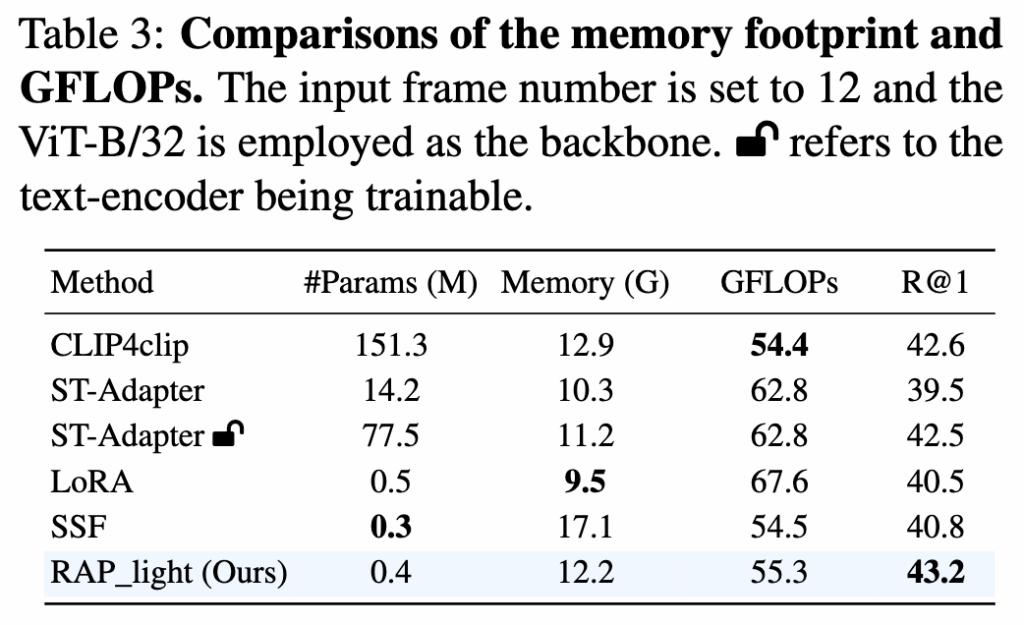 추가로, 제안한 모델의 메모리 사용량과 연산 복잡도를 알아보기 위해, 학습 중 GPU 메모리 사용량과 모델의 GFLOPs를 표 3에 제시했습니다. 여기서 저자는 마지막 4개 레이어에만 LoRM과 ASA를 적용한 RAP_light로 실험을 진행했습니다. 그 결과, 전체 파인튜닝된 CLIP4clip과 비교하여 RAP_light는 학습 가능한 파라미터 수를 크게 줄이면서 메모리 사용량을 약간 낮추고, 동시에 성능은 향상시켰습니다.