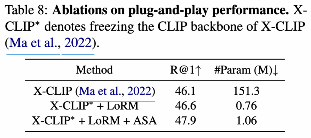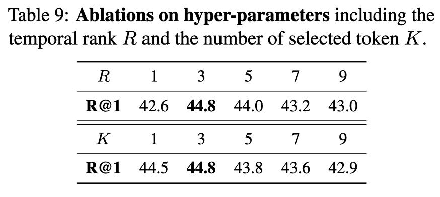 LoRM과 ASA는 plug-and-play 방식의 모듈이기 때문에 기존 CLIP 기반 모델에 추가하여 사용할 수 있습니다. 이를 입증하기 위해 CLIP 기반 방법인 X-CLIP을 기반으로 실험을 진행했으며, 이때 CLIP 백본은 고정하고 각 Transformer 레이어에 LoRM을 삽입한 뒤 기존의 self-attention을 ASA로 대체했습니다. 그 결과는 표 8에 나와 있으며, LoRM과 ASA를 통해 성능이 좋아지는 걸 확인할 수 있었습니다. 또한 하이퍼파라미터 관련 실험도 진행했는데 LoRM에 적용되는 rank R과 ASA가 적용되는 토큰(K 값)을 조절해본 결과 R=3, K=3일 때 가장 좋은 성능이 나왔습니다.