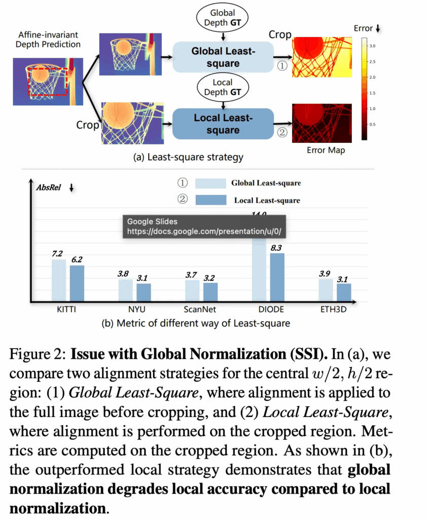 그렇지만 이런 글로벌 정규화는 한 픽셀의 depth 차이가 이미지 전체의 depth 분포에 의해 영향을 받게 됩니다. 특정 영역의 depth 값이 정확하더라도 다른 영역의 값에 따라서 전체 정규화가 틀어져 예측에 좋지 않은 영향을 미칠 수 있는 것이죠.
