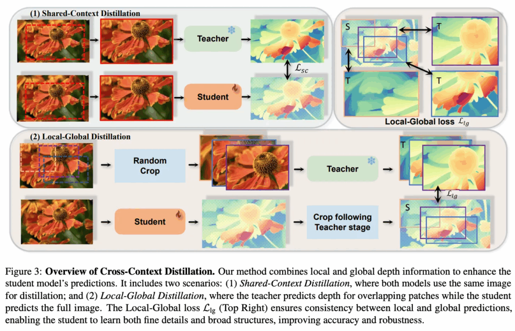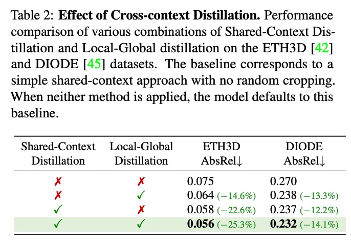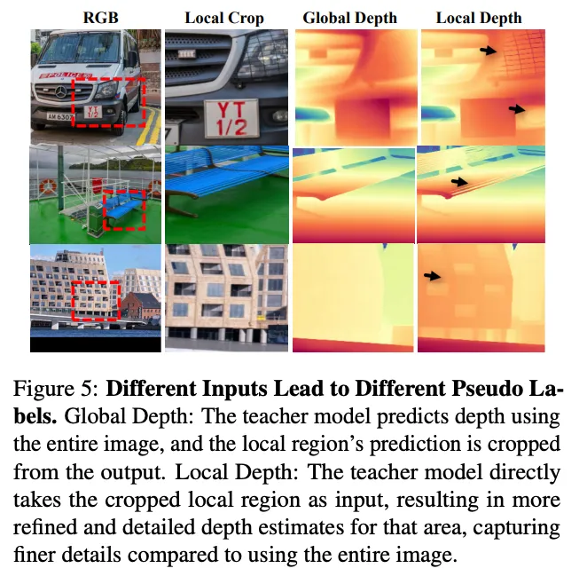 이러한 shared-context distillation은 teacher 모델이 크롭된 영역만 보고 pseudo depth를 예측하여 세밀한 depth 정보가 잘 표현되는 pseudo label을 생성할 수 있도록 합니다. student 모델은 그럼 같은 영역을 보고 학습을 하니 해당 영역에 대해 두 모델을 1대1로 맞추는 구조가 됩니다. 이를 통해 student는 세부적인 구조를 teacher에게서 직접적으로 받을 수 있게 됩니다.