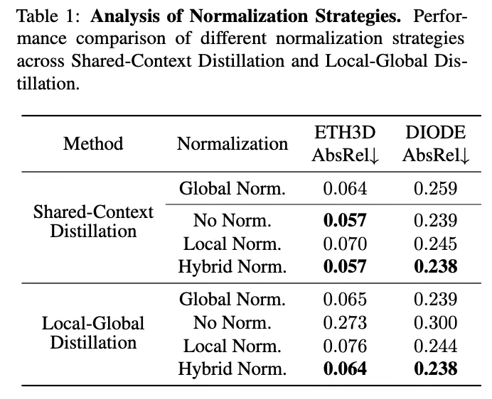 이러한 결과를 기반으로 본 논문에서는 pseudo label distillation 과정에서의 depth 정규화 문제를 다룹니다. 글로벌 정규화, 로컬 정규화, 또는 하이브리드 정규화 등 다양한 depth 정규화 방식을 분석하였다고 합니다.