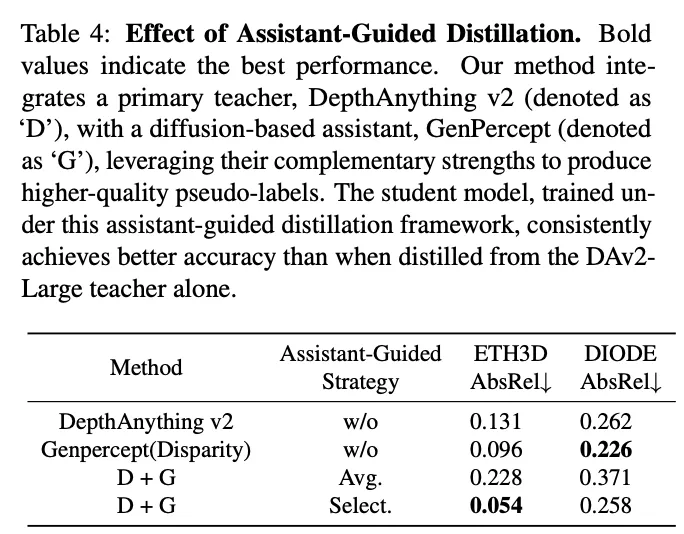 이런 teacher 보조가 필요한 이유는 teacher 모델 하나만 사용하면 그 모델에 편향이 student에 그대로 전달될 수가 있습니다. 이를 막기 위해서 메인 teacher 모델(\mathcal{M})은 DepthAnyting V2와 같은 모델을 쓰고 assistance teacher(\mathcal{M}_a)로는 diffusion 기반의 depth 모델을 사용하였다고 합니다.