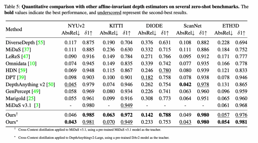 결과적으로 봤을 때 본 모델이 teacher 자체 모델들 대비 일관되게 향상된 성능을 보이고 있습니다. 이러한 결과를 통해 스케일과 depth 데이터의 분포가 다르더라도 적용이 가능하며 student 모델이 teacher를 넘기는 성능을 달성할 수 있음을 보여주고 있습니다.