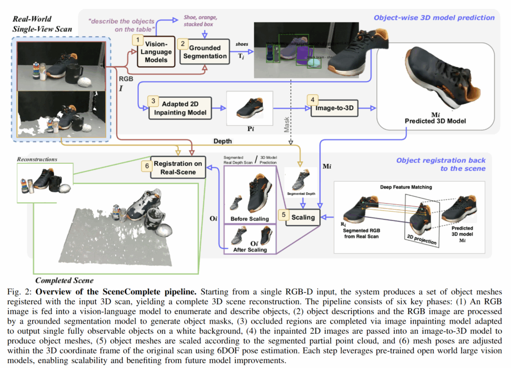 우선 SceneComplete라는 태스크이긴 하지만 결론부터 말하자면 object centric한 (배경없는) scene 복원이 이루어집니다. 단일 RGB-D로부터 VFM을 활용해 scene 내의 물체들의 이름과 색상을 얻어 이 텍스트들을 쿼리로 segmentation mask를 얻습니다. 이후 2D inpainting 모델을 통해 각 객체의 가려진 영역을 보완하여 완전한 2D 이미지를 생성하고, 이 이미지를 image to 3d 모델에 전달하여 정밀한 메쉬를 생성합니다. 마지막으로, 스케일 정합과 6D Pose Estimation을 수행해 생성된 메쉬들을 실제 3D 장면 내에 정확히 정렬해줍니다.