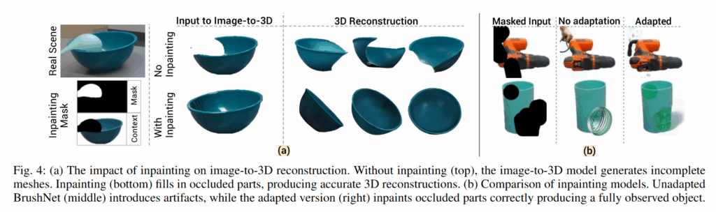 현실의 복잡한 manipulation scene에는 다양한 occlusion이 발생할 수 있으므로, segmentation mask를 inpainting model에 넣어 완전한 2D 이미지를 얻는 과정을 거칩니다. 이때는 BrushNet이라는 모델을 사용한다고 합니다. 하지만 BrushNet은 원래 예술적인 이미지 데이터셋을 기반으로 학습된 모델이기 때문에, 현실적으로 보이지 않는 output이 많았다고 합니다. 이를 해결하기 위해 저자들은 BrushNet을 실제 테이블 위 객체 중심의 도메인에 맞도록 LoRA를 활용해 finetuning 했다고 합니다.