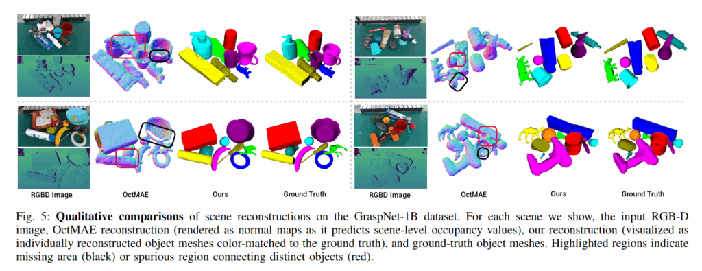 저자들도 로봇 매니퓰레이션 기술은 이제 공장이나 실험실 같은 통제된 환경을 넘어, 가정이나 병원처럼 훨씬 복잡하고 다양한 오픈월드 환경으로 확장되고 있기 때문에 로봇이 안정적이고 세심한 조작을 수행하기 위해서는 주변 환경을 구성하는 물체들의 존재를 구분하고 각 물체의 형상을 정확히 파악하는 능력이 필수적이라고 주장합니다. 그래야만 로봇은 개별 물체에 대해 안정적인 grasp와 placement를 선택할 수 있고, 주변 물체와의 불필요한 충돌 없이 조작을 수행할 수 있기 때문입니다. 하지만 실제 환경에서는 다양한 제약 때문에 이와 같은 장면 표현은 제한적인 입력으로부터 구성되어야 하기 때문에 단 한 장의 RGB-D 이미지로 접근을 시도했다고 합니다.